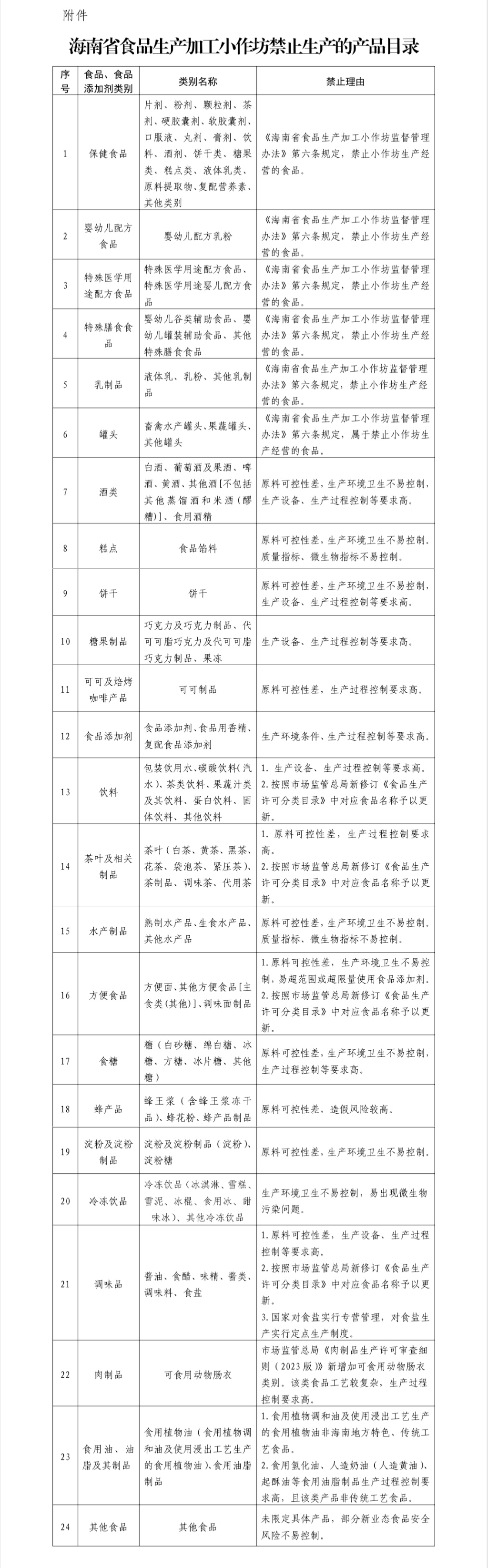 据介绍,为了进一步规范海南省食品生产加工小作坊(以下简称小作坊)的生产加工行为,加强小作坊的监督管理,有效防控小作坊食品安全风险隐患,保障群众舌尖上的安全。根据我国《食品安全法》《市场监管总局关于修订公布食品生产许可分类目录的公告》等有关规定,结合海南省实际情况,经深入调查研究和广泛征求意见,公布了修订后的《海南省食品生产加工小作坊禁止生产的产品目录》。